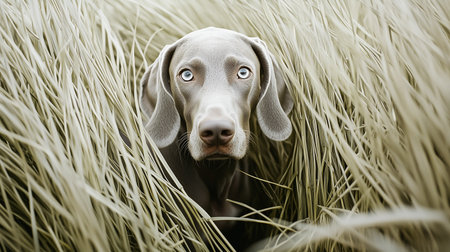 Weimaraner dog in field among dense tall grass. Adorable gray dog with bright eyes.