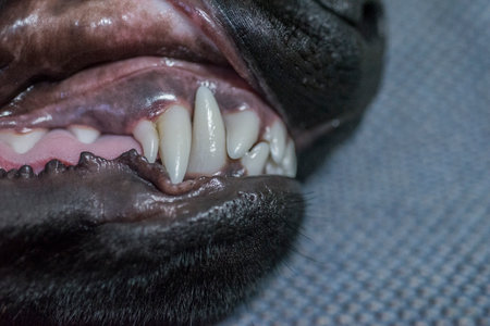 Close-up of a dog's mouth open wide, revealing sharp teeth, showing anger or frustration