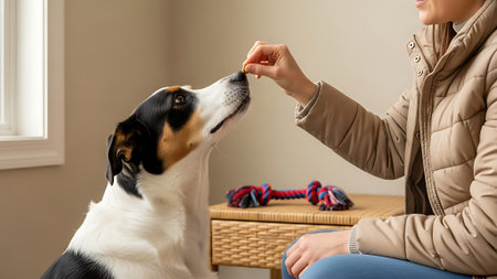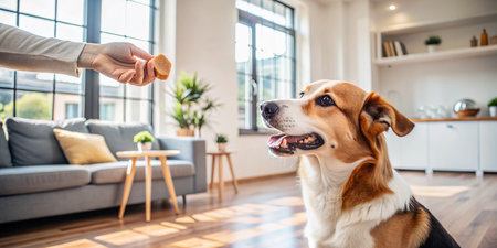 A person's hand offers a tasty treat to a happy dog in a modern indoor house setting with a clean background and ample copy space.