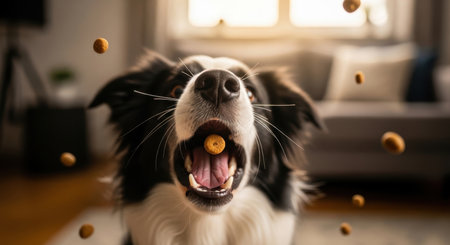 A close up of a border collie dog with its mouth open, expertly catching a single dog treat in mid air. Several other treats are seen falling around the dog in a home environment.