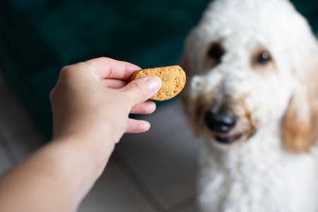 Human hand offering a treat to a dog. Golden doodle getting a treat cookie from the owner. Dog card concep. Copy space