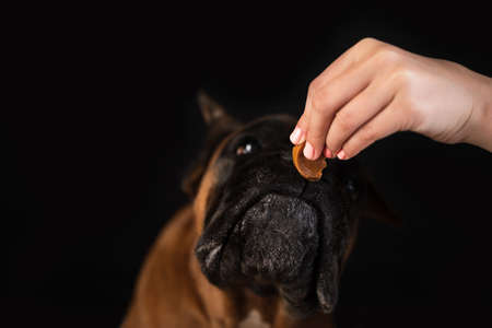 A German boxer dog takes a dog treat from the hands of its owner close-up on a black background. High quality photo