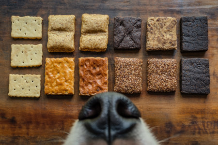 Neatly arranged dog treats and kibble sit on a wooden table, while a curious dogs nose peeks into view from the bottom corner.