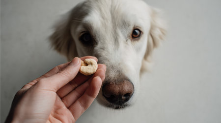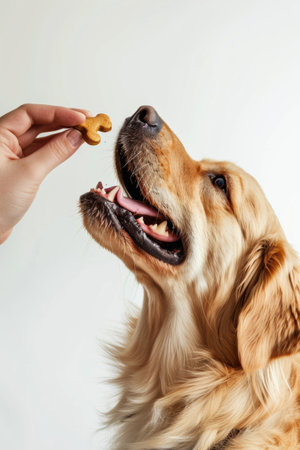 In the warm, golden light of a setting sun, a gentle golden retriever receives a well-deserved treat from its owners hand. This close-up moment captures the deep bond of trust, love, and companionship shared between a human and their loyal canine friend, a perfect illustration of positive reinforcement and care.