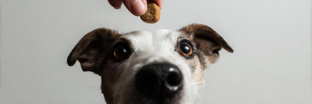 A hand holds freeze-dried treats over a dogs head, capturing the dogs eager anticipation against a clean white background.