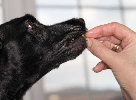 Female hand holding a small piece of food or a treat and placing it into the mouth of a black terrier like dog