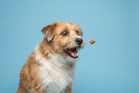Portrait of a cute mixed breed dog eating a biscuit on blue background