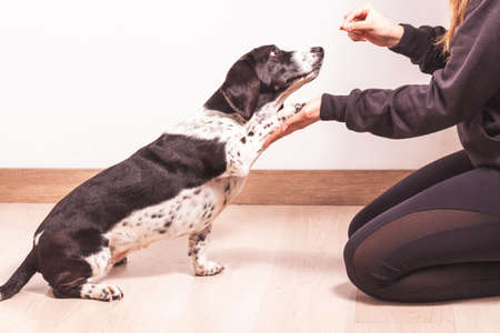 An unrecognizable woman trains her Basset Hound dog by teaching it to paw with a reward. Concept of pets and people