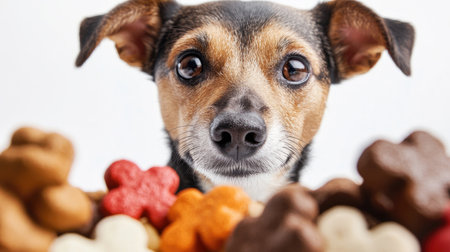 A cute dog looking directly at the camera, surrounded by various dog treats on a white background, emphasizing its eager anticipation for a tasty reward.