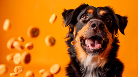 This happy dog, with an exuberant expression, sits excitedly as dog treats are thrown around it, creating a lively atmosphere filled with fun and enthusiasm.