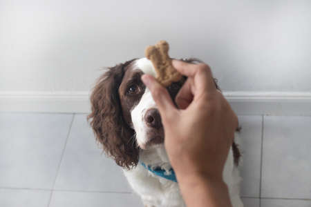 Close-up view of dog eating biscuit. Pet owner feeding his dog in the living room. Dog receiving a treat