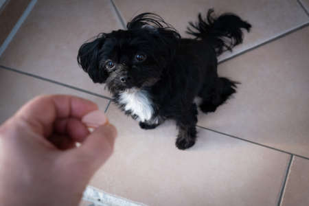 Senior dog waiting for a cookie reward after taking his pills. A day in home of a senior dog