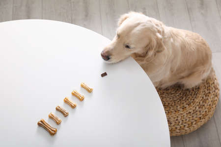Cute Golden Retriever at table with dog biscuits in kitchen, above view