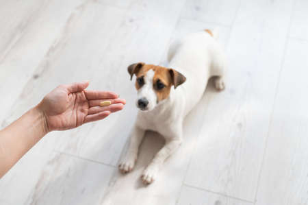 Woman giving the dog jack russell terrier with pill.