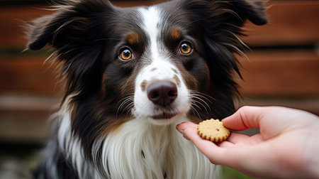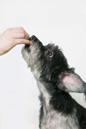 Puppy dog gets an goodie feed, training and reward, bodypart hand