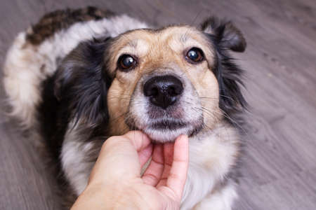 Hand stroking a gray dog, portrait close up