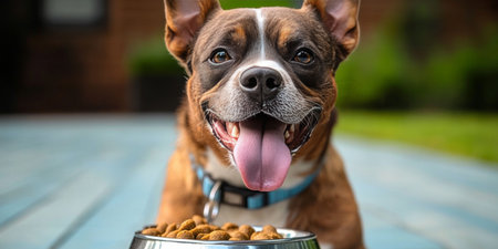 Excited dog happily enjoying his delicious food from a bowl while looking at the camera with joy.