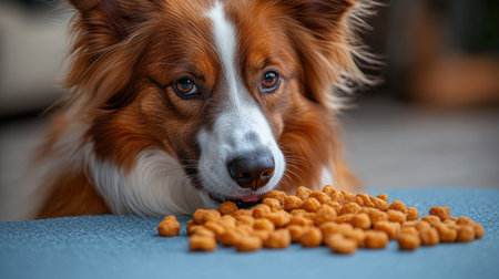 A fluffy brown and white dog savors crunchy snacks spread out on a soft rug