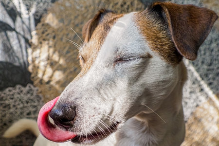 Playful Jack Russell Terrier sticking tongue out and winking against a colorful backdrop, showing humor and pet personality.