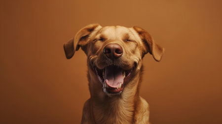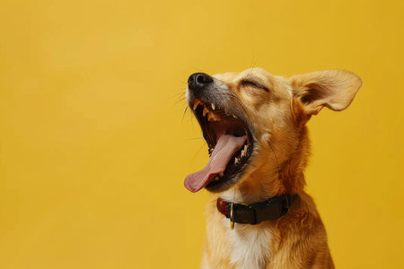 Happy brown dog with a wide smile and tongue out against vibrant yellow backdrop