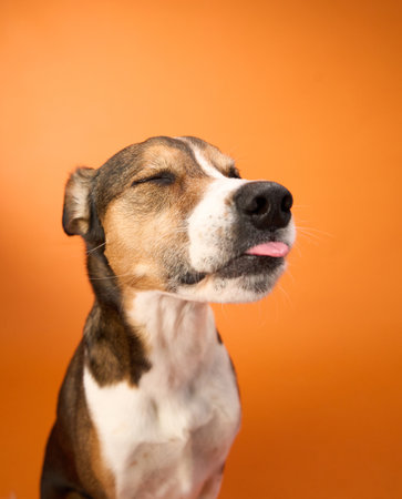 Happy dog with eyes closed and tongue out against a yellow background.