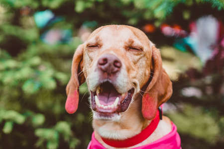 A red hunting dog laughs against the background of greenery. The muzzle of a happy Hungarian vizsla is a close-up in nature.