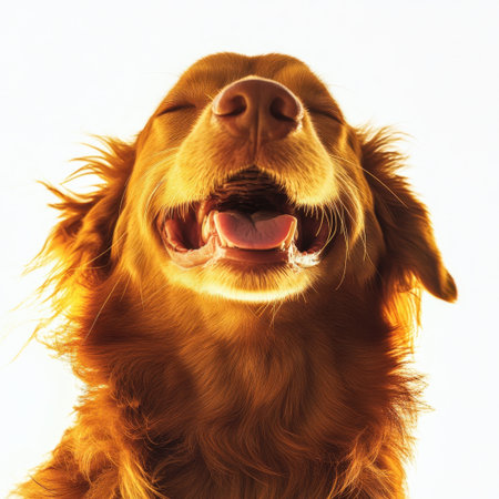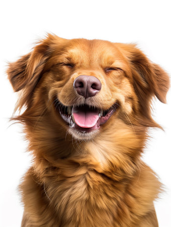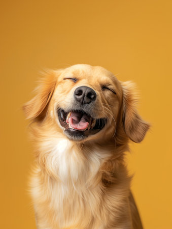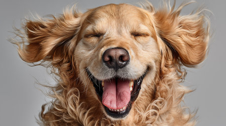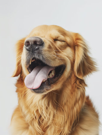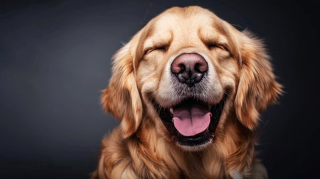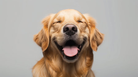 Happy golden retriever dog with closed eyes and big smile, showcasing joy and contentment. soft fur and warm expression create inviting and cheerful atmosphere