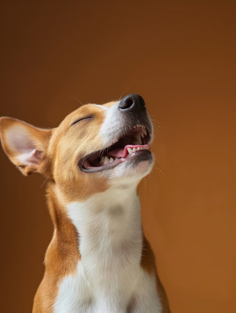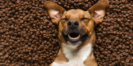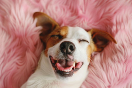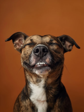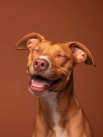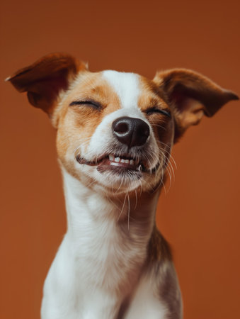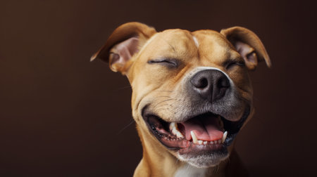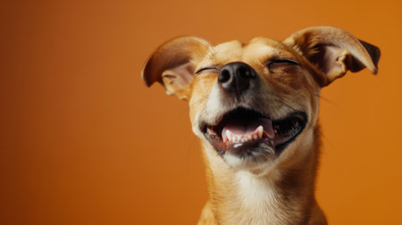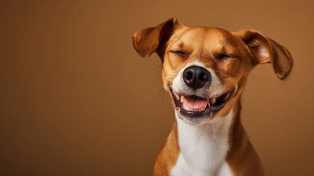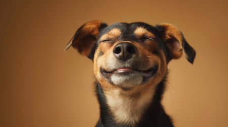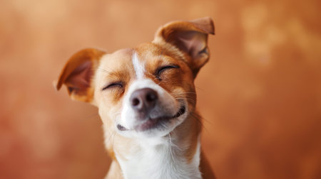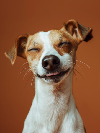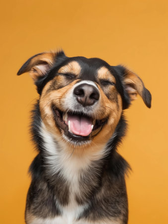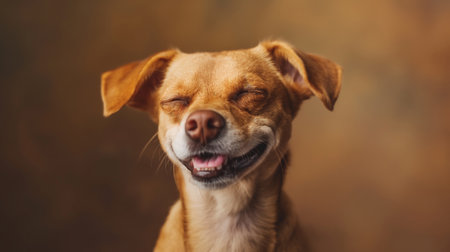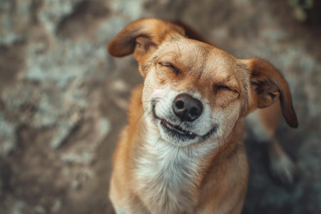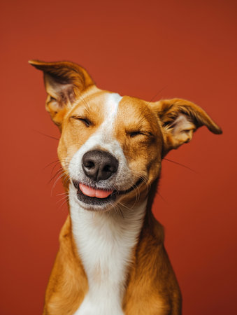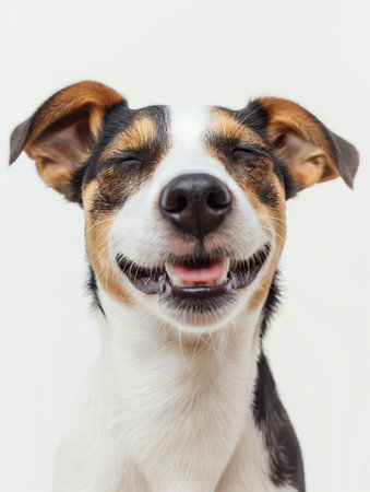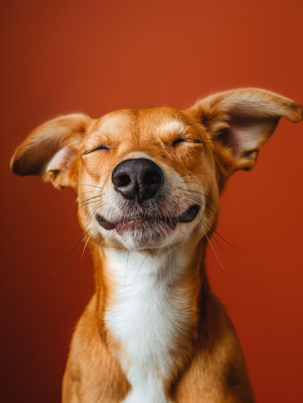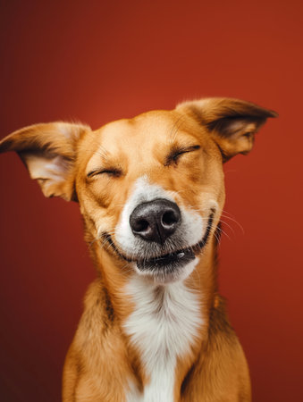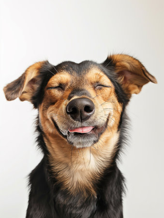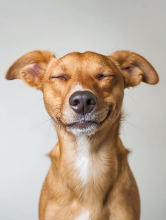 A happy dog appears to smile with closed eyes, embodying pure joy and contentment
