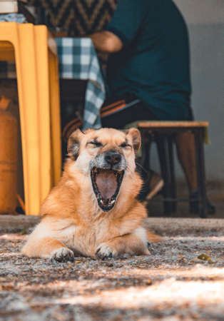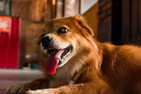 Golden domestic dog relaxing on the terrace of the house, very cute and adorable
