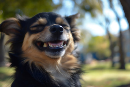 Happy chihuahua dog showing teeth and almost closing its eyes while smiling in a sunny park