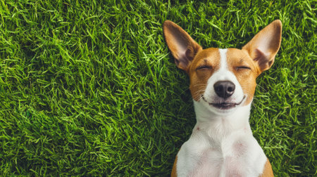 Happy dog lying on lush green grass with eyes closed and ears up