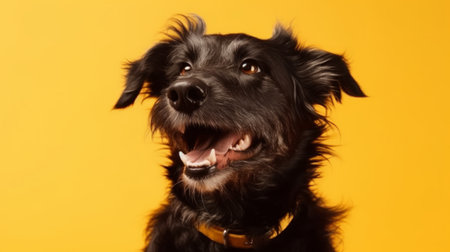 Happy dog on isolated yellow background. Generative AI