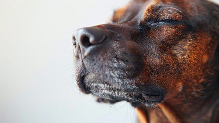 Close-up shot of a dogs face with eyes closed, sniffing the air.