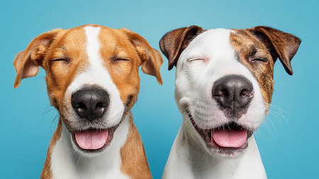 Two funny dogs on a blue background. Close-up portrait.
