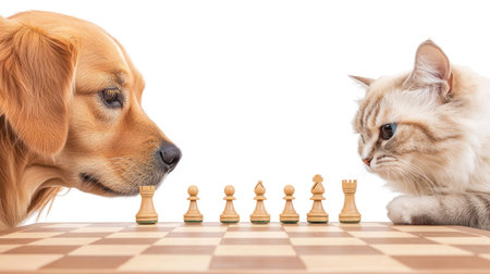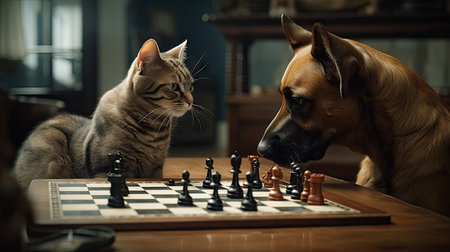 cat and dog are intently focused on chess game, showcasing their playful rivalry.