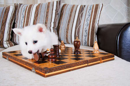 Little puppy lies on a couch and play with chess doll