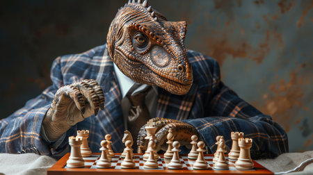 Dinosaur in suit playing chess, studio lighting, quirky and sophisticated