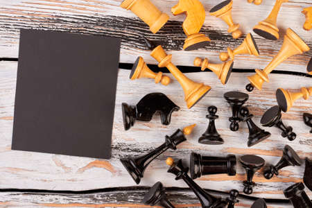 Chess pieces and blank paper card. Black and white chess figures are lying on wooden background. How to be good at chess.
