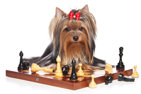 Dog miniature poodle red brown and a white Pomeranian sit next to a chess board, on a white background