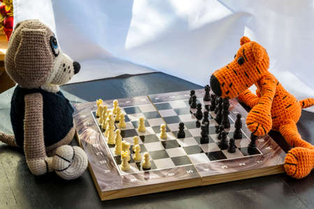 Amigurumi dolls dog and tiger play chess.