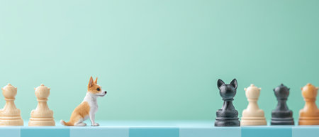 Chess game, two dogs against the background of chess pieces. Dogs sit opposite each other and play chess.