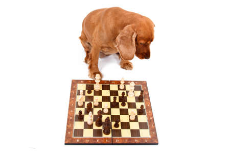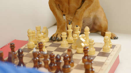 Close-up of a smart dachshund playing chess. Board game.