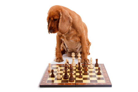 English cocker spaniel dog playing chess, isolated on white background.