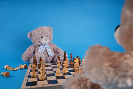 Close up of teddy bears with chess pieces on chessboard. Soft plush toys playing chess on blue background