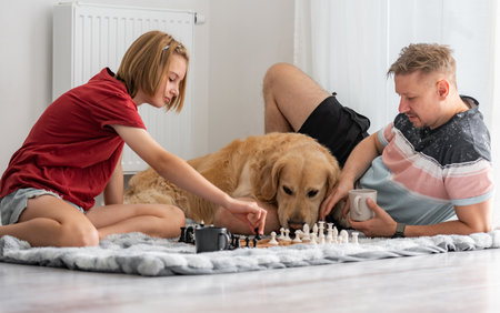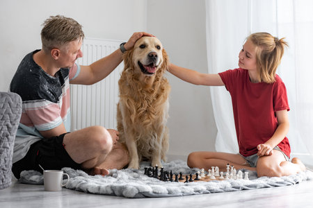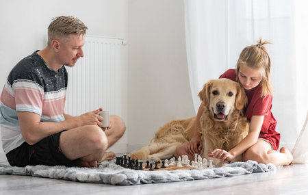 Happy Little Girl And Father Play Chess While Petting Adorable Golden Retriever