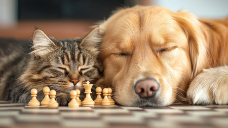 Sleeping dog and cat beside chess pieces create cozy scene.