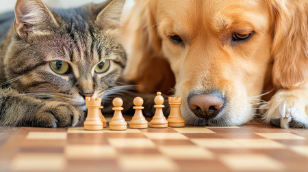 dog and cat are engaged in playful chess match, showcasing their unique personalities.