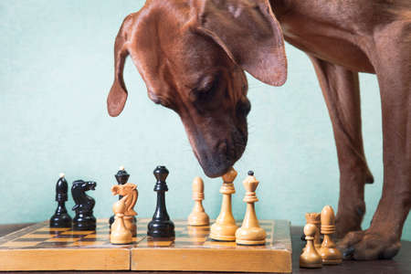 Trained ginger big dog, Rhodesian ridgeback breed, plays chess indoors, on a greenish background