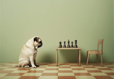 Cute pug sitting playing chess. Minimalistic illustration. AI generated.