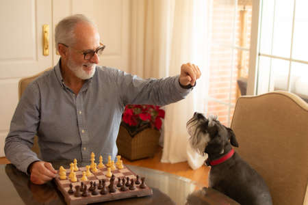 Bearded senior man pensive playing chess in his living room with his dog